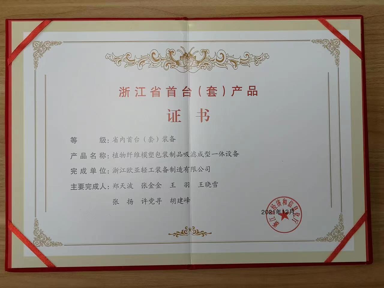 歐亞輕工研發(fā)并生產(chǎn)的“植物纖維模塑包裝制品吸濾成型一體設(shè)備”獲得浙江省首臺(tái)套證書(shū),并獲得政府50萬(wàn)元的獎(jiǎng)勵(lì)。